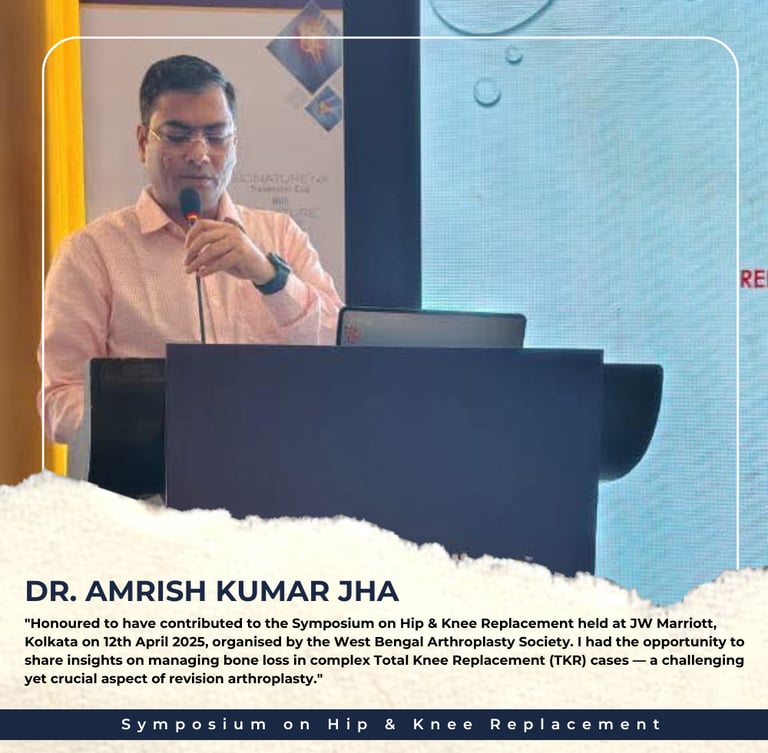 "Honoured to have contributed to the Symposium on Hip & Knee Replacement held at JW Marriott, Kolkata on 12th April 2025, organised by the West Bengal Arthroplasty Society. I had the opportunity to share insights on managing bone loss in complex Total Knee Replacement (TKR) cases — a challenging yet crucial aspect of revision arthroplasty."