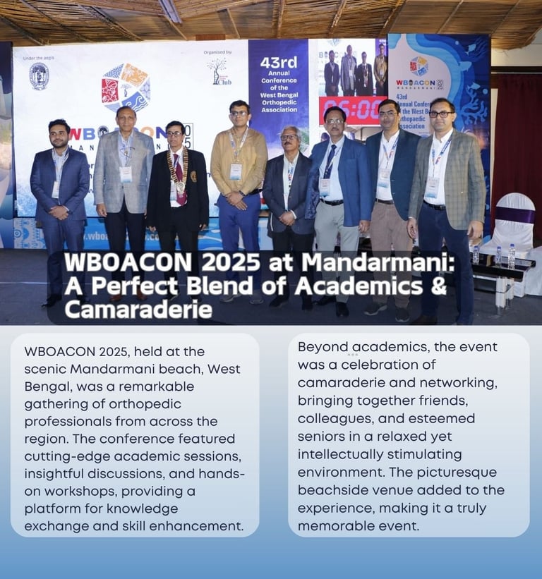 WBOACON 2025 at Mandarmani, WB, was a perfect blend of academics, camaraderie, and hospitality by the sea. The conference featured insightful sessions, hands-on workshops, and expert discussions, fostering knowledge exchange among orthopedic professionals. Surrounded by the serene beach, it was a memorable experience shared with friends, colleagues, and seniors.