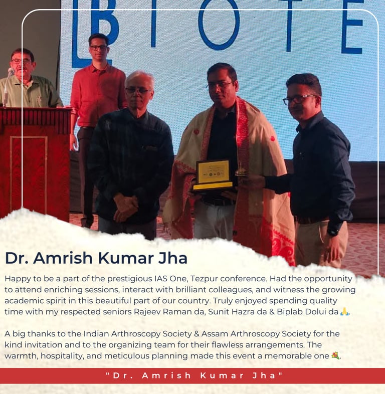Truly grateful to the Indian Arthroscopy Society & Assam Arthroscopy Society for the kind invitation to the IAS One, Tezpur conference. It was a wonderful experience attending enriching sessions, reconnecting with colleagues, and sharing quality time with respected seniors Rajeev Raman da, Sunit Hazra da & Biplab Dolui da 🙏.