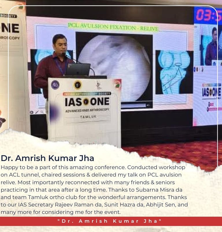 Honoured to be a part of IAS ONE Tamluk, West Bengal on 15th June 2025 — a truly enriching experience. I had the opportunity to conduct a hands-on workshop on ACL tunnel, chair scientific sessions, and deliver a talk on PCL avulsion relive.